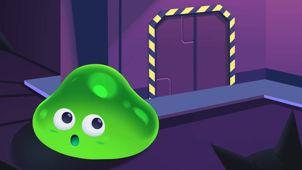 研究所を進むスライムの変身アクション。小さく縮む、伸びる、跳ねる特性を使い分けながら罠だらけのステージを突破していきます。